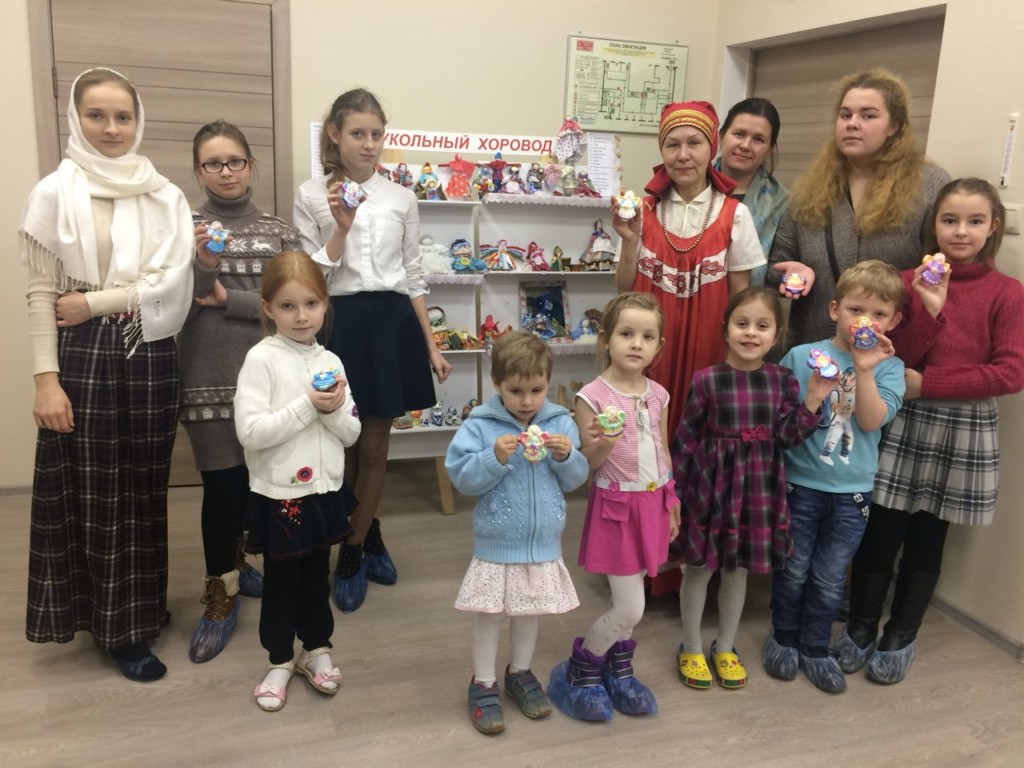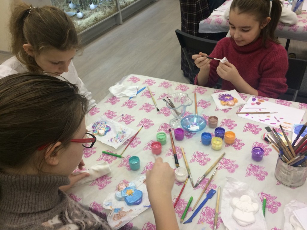 По окончании экскурсии, воскресная школа попробовала себя в творческой мастерской музея – дети приняли участие в росписи игрушек из гипса по мотивам хохломской и дымковской росписи.